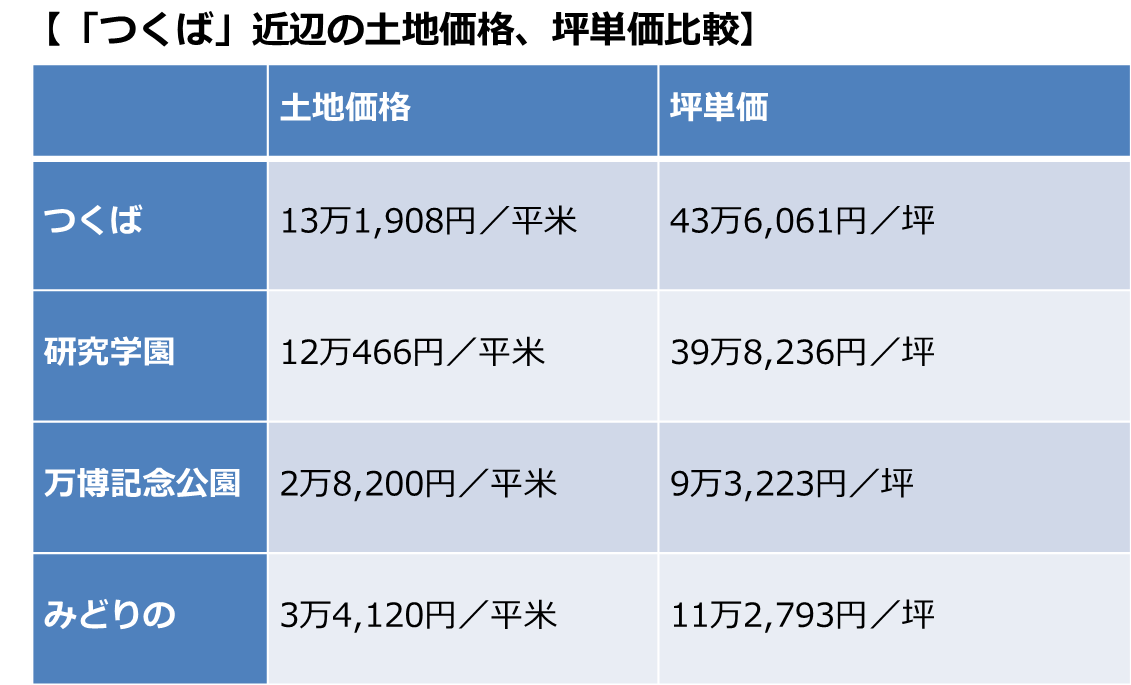中心地のつくば駅周辺は土地価格が高額。前述した竹園高校の学区内は特に人気で、都内と変わらないほどです。隣の研究学園駅周辺も整備が進み、学者など富裕層の方々が暮らしています。なかなか手が出ませんね。万博記念公園、みどりの駅周辺は、最近整備され始めたエリアのためまだ安価で、お得感があります。(つくば在住・Kさん)