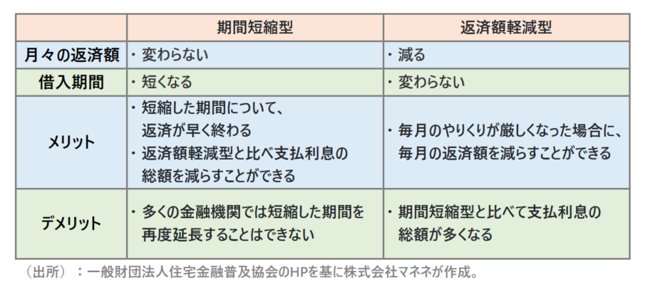 住宅ローンの繰り上げ返済には2つの方法があります。詳細は下表に譲りますが、ざっくり説明すると、「期間短縮型」は毎月の返済額は変わらないが、借入期間が短くなるので、例えば定年前に住宅ローンを払い終えたい人などにオススメであり、「返済額軽減型」は借入期間は変わらないものの、毎月の返済額は減るので1ヶ月の可処分所得を増やしたい人にオススメになります。